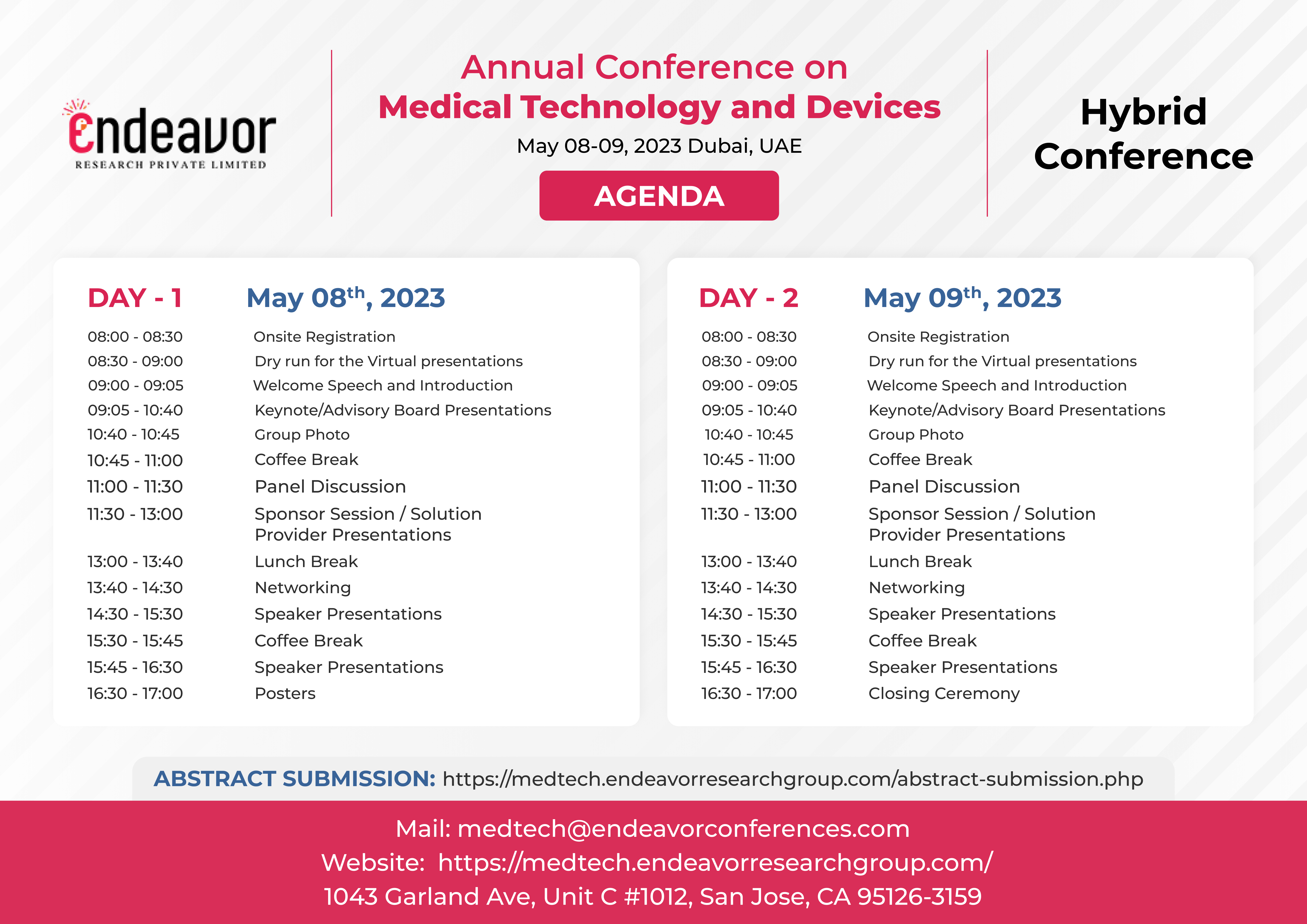The MedTech-2023 Confernece Program will be a Only Virtual Conference, during May 15th and 16th, 2023, inviting presentations around the globe.
